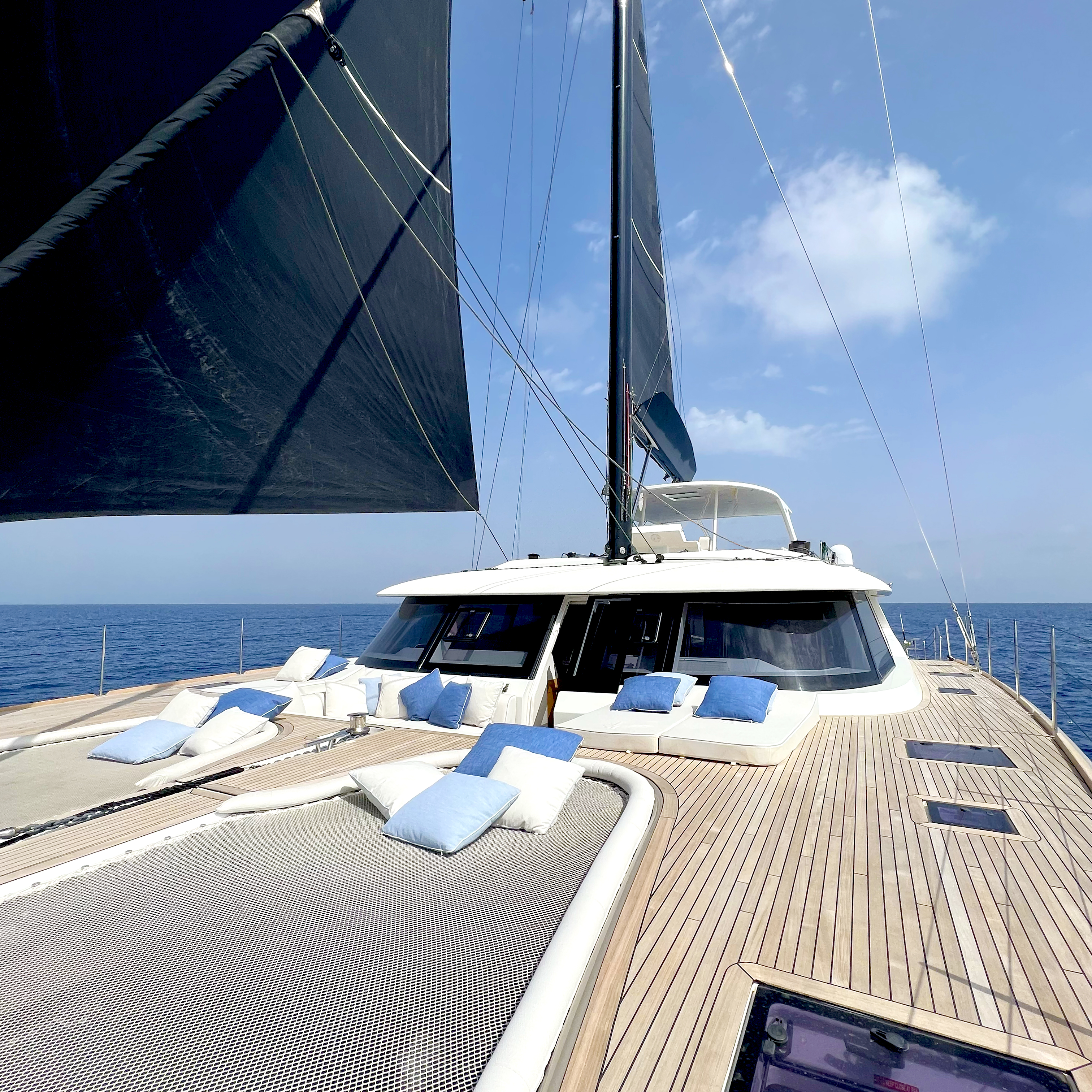 The front terrace, accessible from the saloon, includes sunpads, a sofa, and a table, perfect for outdoor lounging and enjoying scenic views.