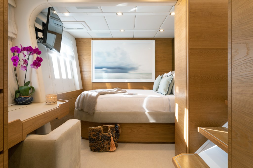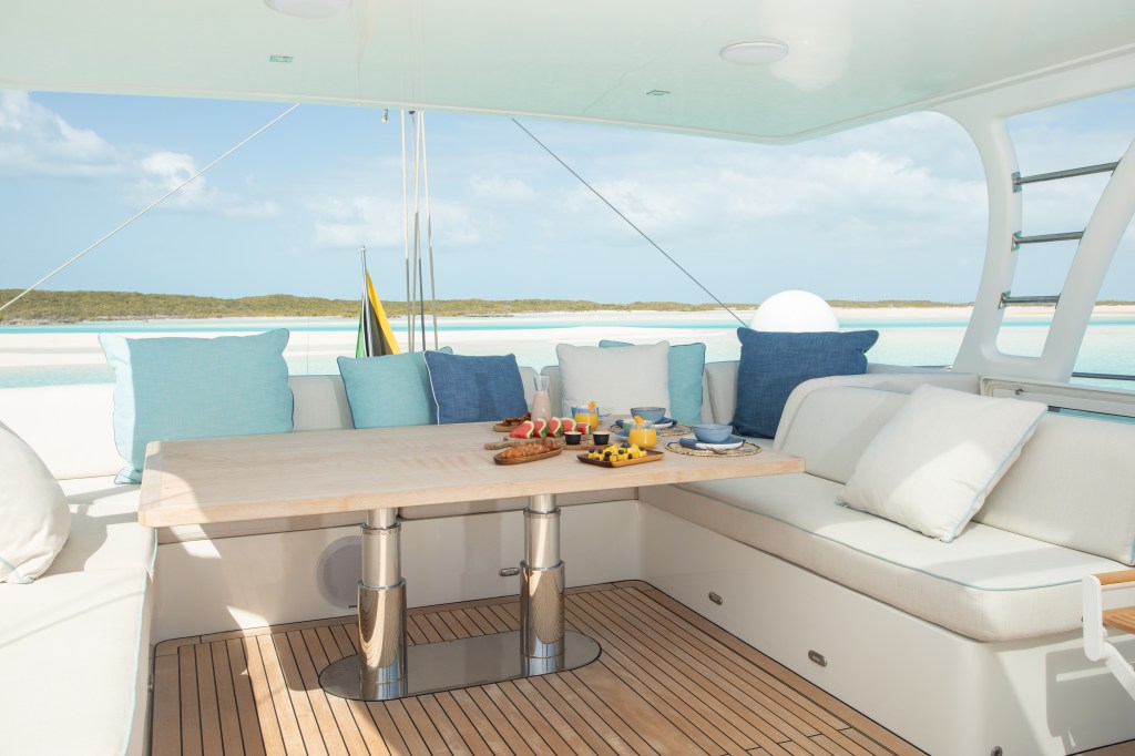 The yacht’s flybridge, cockpit, and front terrace provides ample relaxation options.