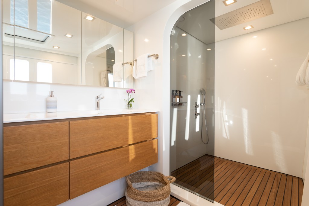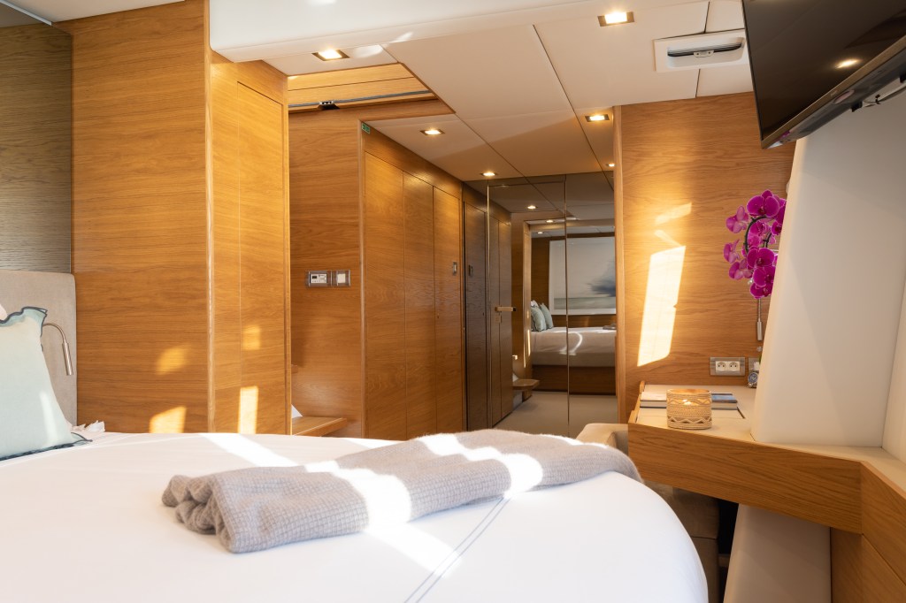 Indablue’s family-friendly layout accommodates up to nine guests with two ensuite guest cabins, a spacious master cabin, and an ensuite twin cabin with a Pullman bed for four.